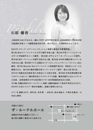 北海道教育大学岩見沢校を卒業、研究生としても一年間在学された石原さん。2015年には札幌市民芸術祭新人音楽会で大賞を受賞されました。国内で数々の賞歴を重ね、現在は演奏活動の傍ら、自宅にてピアノ教室を主宰されるなど後進の指導にも尽力されています。