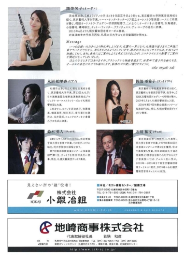 いつも応援いただき心から御礼申し上げます。札響の一員となり、北海道の皆さまのご声援に育てていただきながら、早5年を迎えようとしています。節目の年のこのリサイタルは、当初、春先にはご案内しようと考えておりましたが、コロナウイルスの影響でご案内が間近になってしまいました。ほんのひとときではありますが、クラシックから映画音楽まで、世界中で愛される曲たちを、オーボエの音色にのせてお届けします。公演では素晴らしい共演者の方々をお招きして、聴きごたえのある一夜になることと思います。皆様の心に優しく響きますように。