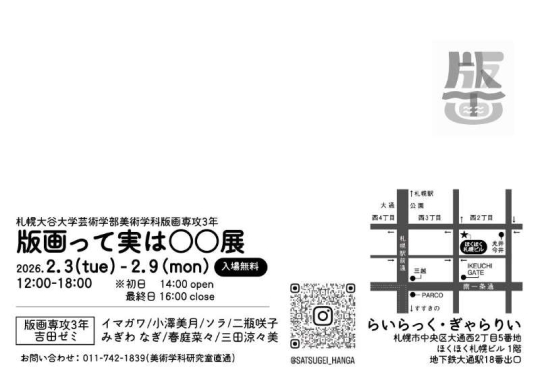 「版画って、実はもっと自由?」 札幌大谷大学美術学科版画専攻3年生7名が企画・立案した展覧会「版画って実は◯◯?展」を開催します。木版画・銅版画・リトグラフ・シルクスクリーンなど、さまざまな技法を使った作品を通して、摺る/刷ることで生まれる偶然やズレ、不自由さの中に広がる表現の面白さを紹介します。ファインアートとデザインの間を行き来する版画の魅力を、学生ならではの視点で楽しく発信。ちょっと意外で、ちょっと新しい“版画の世界”をのぞいてみませんか?