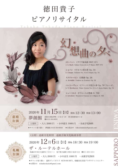 徳田貴子さんは高校卒業後10年間のアメリカ留学を経て2016年に完全帰国。現在は地元の恵庭市と札幌市を中心に演奏家として活躍される傍ら、後進の指導にも尽力されています。平成30年度札幌市民芸術祭大賞を受賞されるなど、今や大注目のピアニストのお一人です。昨年のリサイタルでは古典派から自由な風を感じるジャズ風のクラシック曲まで、躍動感あふれる圧巻の演奏でお客様を魅了しました。今年は数々の「幻想曲」に想いをのせて、私たちにどんな感動を与えてくださるのでしょうか。