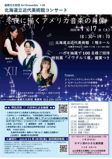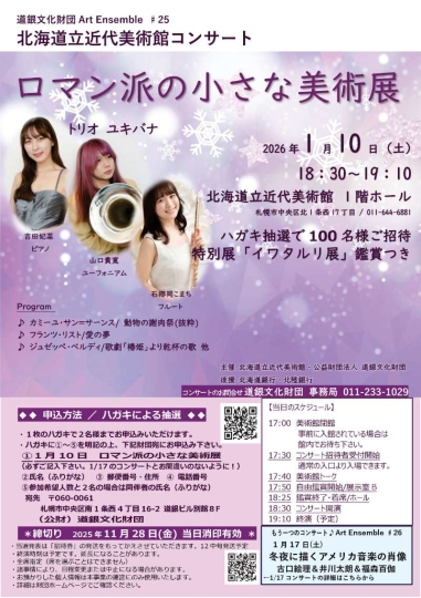 北海道立帯広美術館を会場に、展覧会鑑賞付きコンサートを開催します。