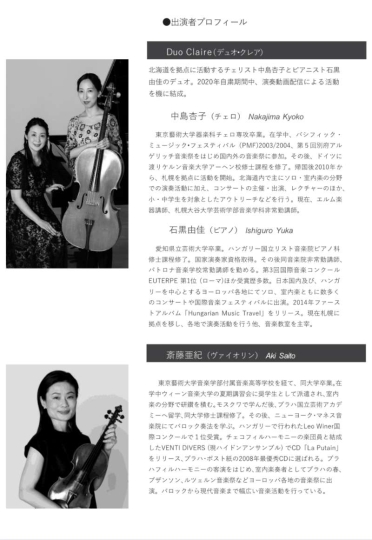 ウェブサイトやパンフレットなどで私たちを見つけて下さった皆様、ありがとうございます。Duo Claire(デュオクレア)のコンサートは3回目となる今回は、「ピアノと弦で彩る若きショパンの想い」をテーマに、普段ピアノ曲に向きがちなショパンの曲を、ピアノ三重奏やチェロとピアノのデュオで取り上げます。