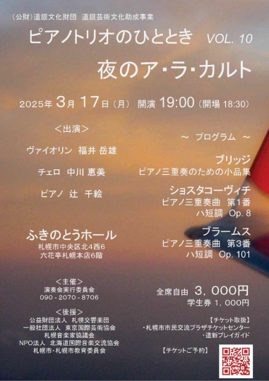 この10年ブラームスの室内楽作品を軸に、現代曲や委嘱作品など様々な曲に取り組んで来ました。この10年の歳月がトリオの響きをどのように変化させたか、演奏者自身も楽しみにしております。